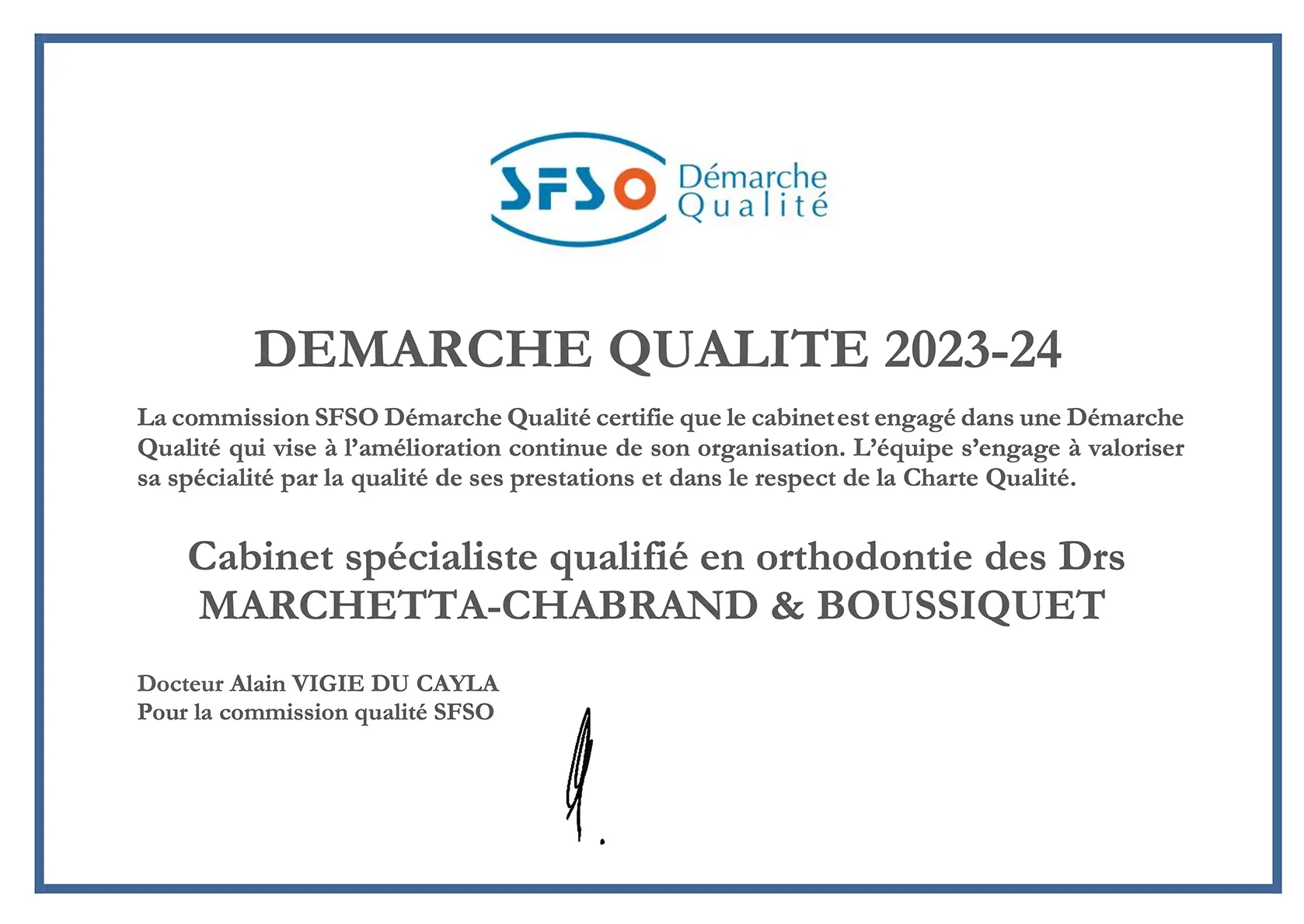 Notre cabinet est engagé dans la Démarche Qualité du Syndicat Français des Spécialistes en Orthodontie. Celle-ci vise à améliorer en permanence notre organisation, et ce, pour votre bien-être et votre satisfaction…
